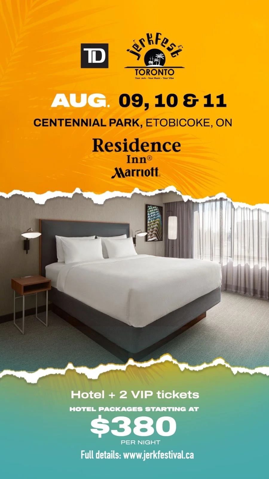 Indulge in the comfort of a stylish one-bedroom accommodation just moments away from all the festival excitement. All Bedrooms Include Breakfast at the Residence Inn Marriott. The Hotel is 7 minutes from Centennial Park (5070 Creekbank Road, Mississauga). Plus, elevate your experience with VIP Boat Cruise tickets, offering breathtaking views and a taste of true Caribbean hospitality on the open seas.