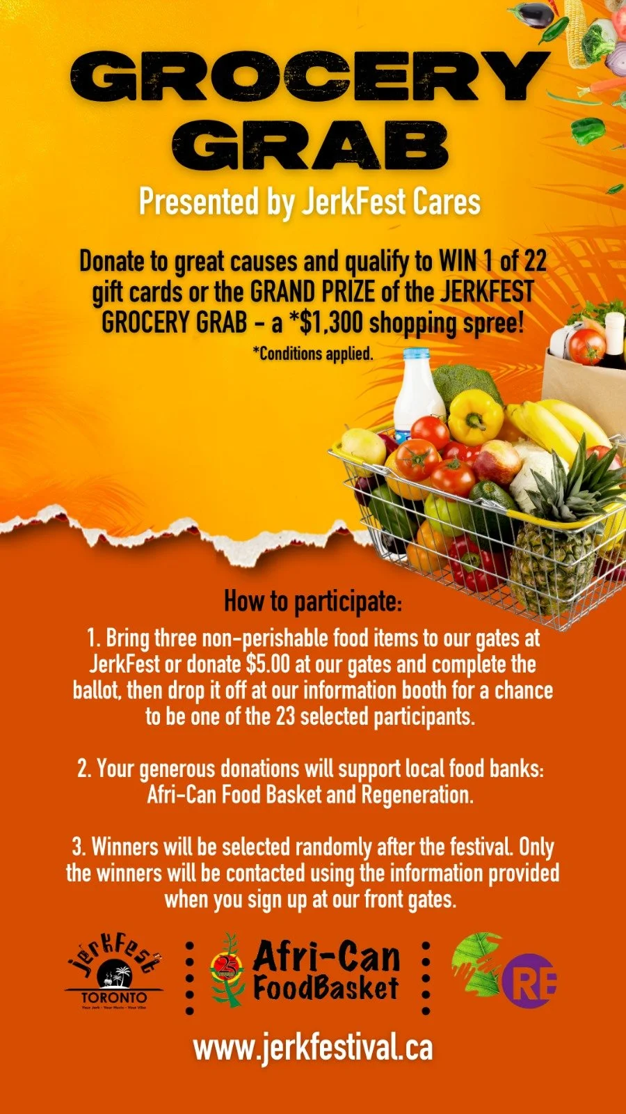 1. Bring three non-perishable food items to our gates at JerkFest or donate $5.00 at our gates and complete the ballot, then drop it off at our information booth for a chance to be one of the 23 selected participants.